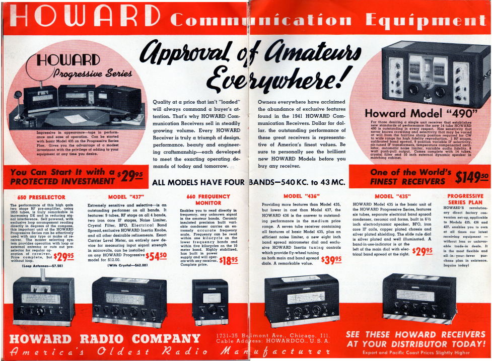 435-A Howard 435 Howard 435-A Frequency Range: 550 kHz to 40 MHz 550 kHz to 43 MHz Number of Tubes: Years Built: Original Price: Other comments: Internal Speaker, optional